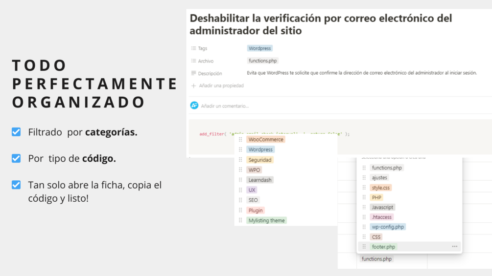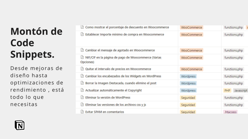 Cientos de code snippets para Wordpress organizados en Notion